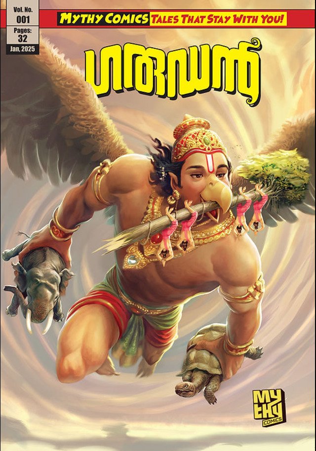 ബ്രഹ്മാവിൻ്റെ പൗത്രനായ കശ്യപമുനിക്ക് വിനതയിലുണ്ടായ പുത്രനാണ് ഗരുഡൻ. കശ്യപ മുനി പുത്രലബ്ധിക്കായി നടത്തിയ യജ്ഞത്തിൻ്റെയും, തപശക്തിയാർന്ന ബാലഖില്യന്മാരുടെ അനുഗ്രഹത്താലും അമാനുഷിക ശക്തികളുമായാണ് പക്ഷിരാജനായ ഗരുഡൻ്റെ ജനനം. പന്തയത്തിൽ ചതിവുപറ്റി തോറ്റതിൻ്റെ ഫലമായി ദാസ്യവൃത്തി ചെയ്യേണ്ടി വന്ന അമ്മയെ മോചിപ്പിക്കുന്നതിനായി ഗരുഡൻ ദേവലോകത്തിലെത്തി അമൃത കുഭം കൈക്കലാക്കുന്നു. ഗരുഡൻ്റെ സത്യസന്ധതയിൽ സന്തുഷ്ടനായ മഹാവിഷ്ണു ഗരുഡന് വരമായി അമരത്വമേകുകയും തൻ്റെ വാഹനമായി സ്വീകരിക്കുകയും ചെയ്തു. അമൃത് വീണ്ടെടുക്കാനായി ഗരുഡനോടെതിരിട്ട് പരാജിതനായ ദേവേന്ദ്രൻ ഗരുഡനുമായി മിത്രതയിലാവുന്നു. ഇന്ദ്രൻ്റെ അഭ്യർത്ഥന മാനിച്ച്, തൻ്റെ അമ്മയുടെ സ്വാതന്ത്ര്യാനന്തരം അമൃത് വീണ്ടെടുക്കാൻ ഗരുഡൻ ഇന്ദ്രനെ സഹായിക്കുന്നു. അമ്മയുടെ ദാസ്യവൃത്തിയിൽ നിന്നുള്ള മോചനാനന്തരം മഹാവിഷ്ണുവിൻ്റെ വാഹനമാവാനായി ഗരുഡൻ യാത്രയാവുന്നു