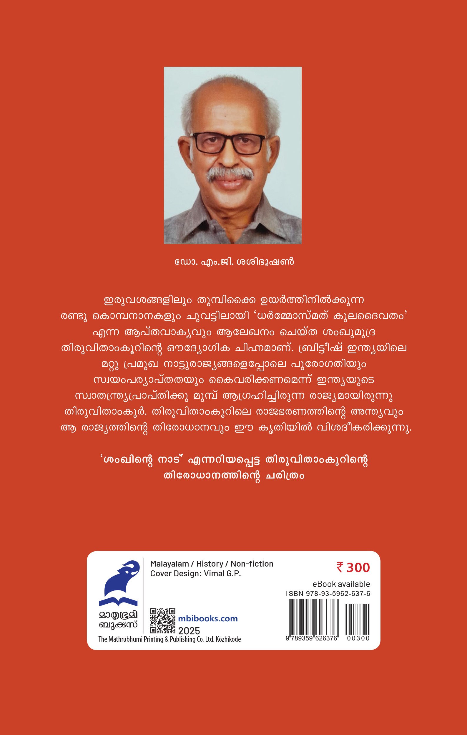 ഇരുവശങ്ങളിലും തുമ്പിക്കൈ ഉയര്ത്തിനില്ക്കുന്ന രണ്ടു കൊമ്പനാനകളും ചുവട്ടിലായി ‘ധര്മ്മോസ്മത് കുലദൈവതം’ എന്ന ആപ്തവാക്യവും ആലേഖനം ചെയ്ത ശംഖുമുദ്ര തിരുവിതാംകൂറിന്റെ ഔദ്യോഗിക ചിഹ്നമാണ്. ബ്രിട്ടീഷ് ഇന്ത്യയിലെ മറ്റു പ്രമുഖ നാട്ടുരാജ്യങ്ങളെപ്പോലെ പുരോഗതിയും സ്വയംപര്യാപ്തതയും കൈവരിക്കണമെന്ന് ഇന്ത്യയുടെ സ്വാതന്ത്ര്യപ്രാപ്തിക്കു മുമ്പ് ആഗ്രഹിച്ചിരുന്ന രാജ്യമായിരുന്നു തിരുവിതാംകൂര്. തിരുവിതാംകൂറിലെ രാജഭരണത്തിന്റെ അന്ത്യവും ആ രാജ്യത്തിന്റെ തിരോധാനവും ഈ കൃതിയില് വിശദീകരിക്കുന്നു.